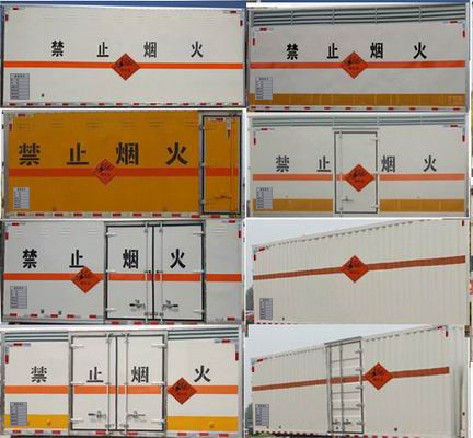 隨底盤選裝駕駛室;選裝側(cè)門型式及位置,選裝不開側(cè)門,廂體側(cè)面板選裝開百葉窗,選裝瓦楞板結(jié)構(gòu);安裝起重尾板(收起狀態(tài)水平長度為280mm),尾板質(zhì)量為350kg;該車用于運輸具有獨立容器(瓶)包裝的:黑火藥,壓縮黑火藥,電(非電)引爆雷管,爆破用,專用煙火制品,無煙火藥,糊狀火藥,爆破炸藥,導(dǎo)爆索,軟的,點燃導(dǎo)火索,射彈,帶有爆炸裝藥,聚能裝藥,不帶雷管,聚能炸藥,不帶雷管,非電引爆雷管組件,爆破用,油井用彈藥筒,固態(tài)推進劑,動力裝置用彈藥筒,商品爆炸裝藥,不帶雷管,運送爆炸品的項號:1.1 D,1.1 D,1.1B,1.1B,1.1G ,1.1C,1.3C,1.1 D,1.1 D,1.4G,1.1D,1.1 D,1.1B,1.1B,1.3C,1.1C,1.3C,1.1D;運送危險貨物車輛的類型:EX/Ⅲ型車輛;該車為危險品貨物運輸車;僅采用前輪盤式制動器,前置排氣管,子午線輪胎,限速裝置的底盤,限速80km/h;轉(zhuǎn)向輪安裝爆胎應(yīng)急防護裝置;發(fā)動機/油耗申報值(L/100km)對應(yīng)關(guān)系為:F2.8NS6B131/11.1,Q28-130E60/11.1;該車安裝具有衛(wèi)星定位功能的行駛記錄儀;ABS系統(tǒng)型號:ABS-VI.E;生產(chǎn)企業(yè):廣州瑞立科密汽車電子股份有限公司.ABS系統(tǒng)型號:ABS-E;生產(chǎn)企業(yè):威伯科汽車控制系統(tǒng)(中國)有限公司;側(cè)面防護及后下部防護裝置材料材質(zhì):Q235,連接方式:焊接連接;后下部防護圓形后防護;后下部防護裝置斷面尺寸為:Φ120mm,離地高度:310mm;該車型可選裝直接供電ETC車載裝置.選裝不帶尾板時,后防護材料:Q235,連接方式焊接,后防護截面高120mm,截面寬60mm,下邊緣離地高310mm. |