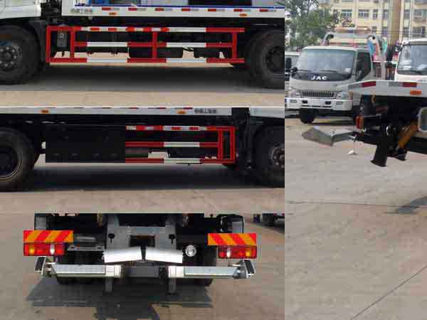 托舉質量:4960kg;選裝擺臂平板裝置時整備質量為7800kg、托舉質量為4500kg;軸距4700mm對應整車長9130mm;軸距5000mm對應整車長9430mm;側防護Q235B采用螺栓連接;后防護由專用裝置替代,Q235B焊接。ABS廠家及型號:東風電子科技股份有限公司制動系統公司/3631010-C2000。 |