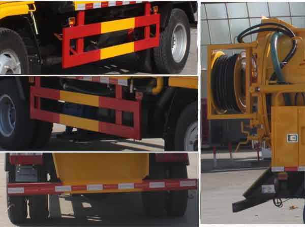 水罐罐體有效容積:1.5立方米,運輸介質: 水,密度:1000千克/立方米,罐體外形尺寸(長×直徑)(mm):1500×1200。吸污罐罐體有效容積:1.80立方米,運輸介質: 液態污物,密度:900千克/立方米,罐體外形尺寸(長×直徑)(mm):1600×1200。水罐和吸污罐為兩個獨立罐體,清洗功能時用水罐, 吸污功能時用吸污罐,清洗吸污兩種功能不同時使用。防護材料:Q235A碳鋼,連接方式:左右側面及后下部防護均采用焊接連接,后部防護斷面尺寸(mm):100×50,后部防護離地高度(mm):430。隨底盤選裝前面罩,前保險杠,前組合燈具. |