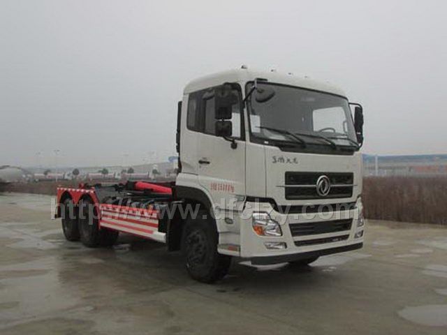 東風天龍拉臂式垃圾車是車廂可卸式垃圾車的一種,利用翻轉架與活動拉臂把垃圾箱拉到附車架上,用側向導向塊定位及鎖緊鉤鎖緊定位,整車行駛中箱體無歪斜現象,具有結構簡單、操作穩定方便、裝卸效率高、機械化程度高、節省人力的優點。