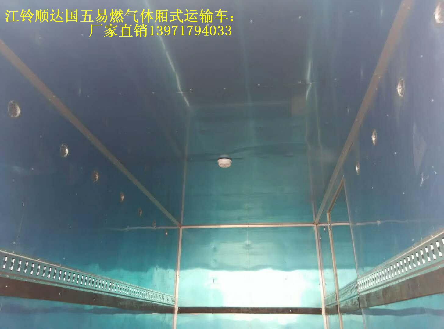 江鈴順達(dá)易燃?xì)怏w廂式運輸車廂體外飾冷軋鋼板,內(nèi)飾防靜電鋁板,底板鋪防靜電膠板,側(cè)壁設(shè)防雨通風(fēng)窗口,帶捆綁固定拉環(huán),煙霧感應(yīng)器,防盜報警開關(guān),靜電帶,滅火器2只,車廂黃色,有危險標(biāo)志,貼有反光標(biāo)識。