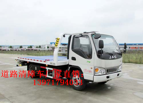 江淮康鈴一拖二國五平板型道路清障車上裝配置:起重裝置、托舉牽引裝置、液壓系統、電控系統、車體與工具箱等組成,具有起吊、拽拉和托舉牽引等多項功能。