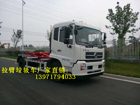 例如:東風(fēng)拉臂式垃圾車(chē)是車(chē)廂可卸式垃圾車(chē)的一種,利用翻轉(zhuǎn)架與活動(dòng)拉臂把垃圾箱拉到附車(chē)架上,用側(cè)向?qū)驂K定位及鎖緊鉤鎖緊定位,整車(chē)行駛中箱體無(wú)歪斜現(xiàn)象,具有結(jié)構(gòu)簡(jiǎn)單、操作穩(wěn)定方便、裝卸效率高、機(jī)械化程度高、節(jié)省人力的優(yōu)點(diǎn)。