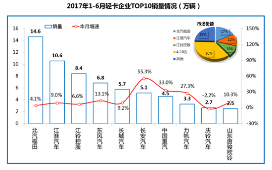 2017年1-6月,我國輕型貨車產銷84.50萬輛和85.26萬輛,同比增長9.36%和9.66%。其中,北汽福田累計銷售輕型貨車14.6萬輛,排名第一,同比增長4.1%;銷量前十名中,長安汽車銷量增幅最大,增幅達到了55.3%。輕卡企業銷量見下圖: