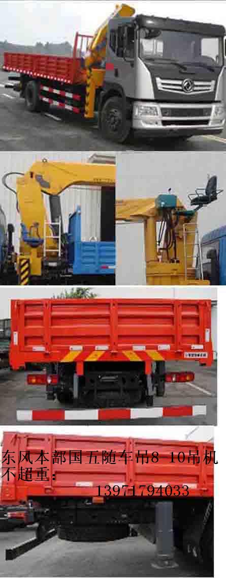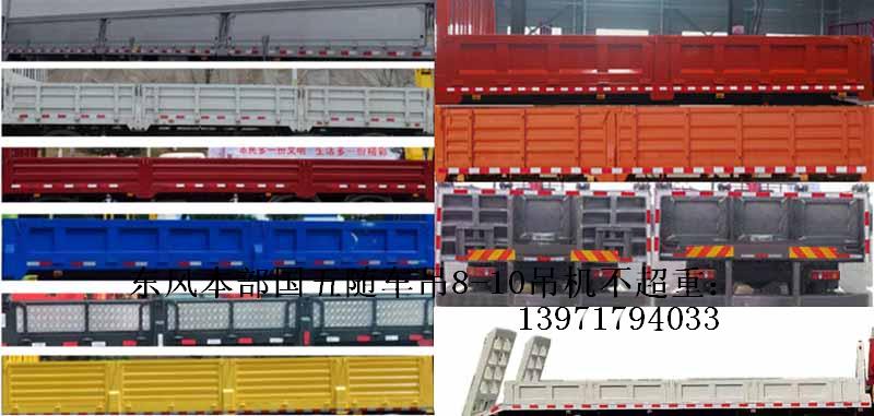 東風本部單橋國五隨車起重運輸車可選裝前面罩,保險杠;選裝貨箱形式;選裝貨箱自卸功能,自卸方式后卸隨底盤選裝駕駛室.