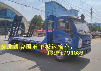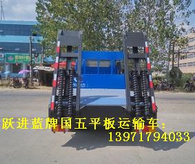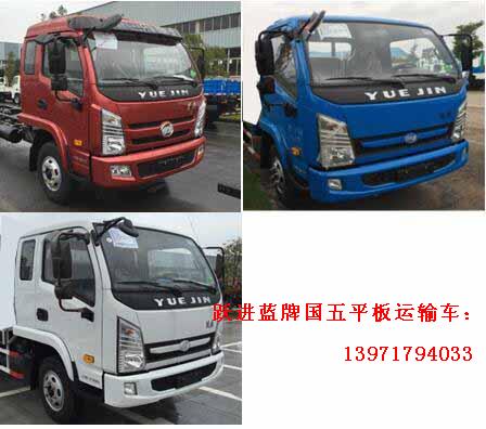 南京躍進藍牌國五平板運輸車采用南京躍進平板運輸車專用二類工程車底盤,選裝云內102馬力國五發動機,五擋帶副變速箱,輪胎為鋼絲胎7.50R16 6PR,安裝帶有衛星定位功能的行駛記錄儀. ABS,選裝駕駛室.