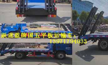 南京躍進藍牌國五平板運輸車用于裝載運輸工合機械、挖機、鏟車、收割等工合機械運輸,車后部帶后爬梯,帶支腿(液壓或手動),底板為5mm花紋鋼板,方鋼承載筋,貨臺承載面尺寸長4000mm, 寬2400mm,承載面可選裝手動或液壓水平支出.平板離地高度:950mm。爬梯長度1000-1500mm,傾角30-45度.
