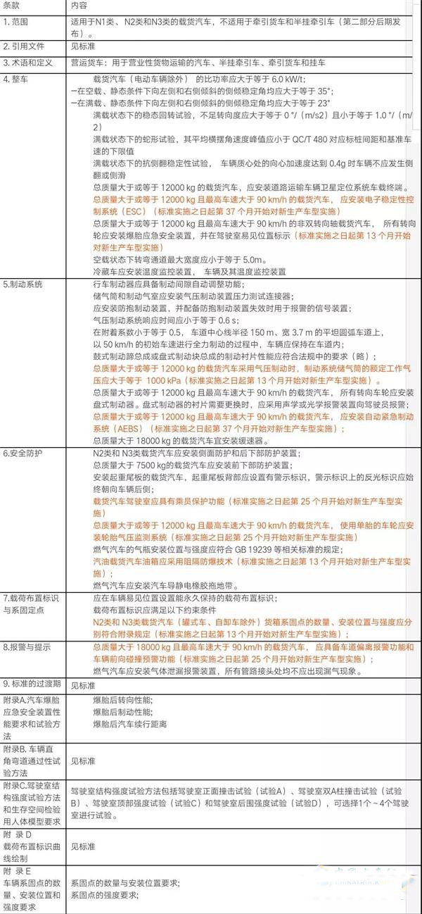 以下為《營運(yùn)貨車安全技術(shù)條件第1部分:載貨汽車》,橙色部分為過渡條款。