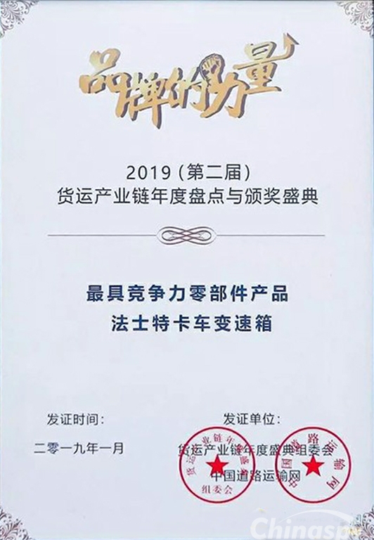 昨日,“品牌的力量”2019貨運產(chǎn)業(yè)鏈年度盤點與頒獎盛典在京順利召開。法士特變速器榮獲“最具競爭力零部件產(chǎn)品”獎。