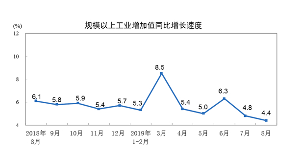 2019年8月份,規(guī)模以上工業(yè)增加值同比實際增長4.4%(以下增加值增速均為扣除價格因素的實際增長率),比7月份回落0.4個百分點。從環(huán)比看,8月份,規(guī)模以上工業(yè)增加值比上月增長0.32%。1—8月份,規(guī)模以上工業(yè)增加值同比增長5.6%。