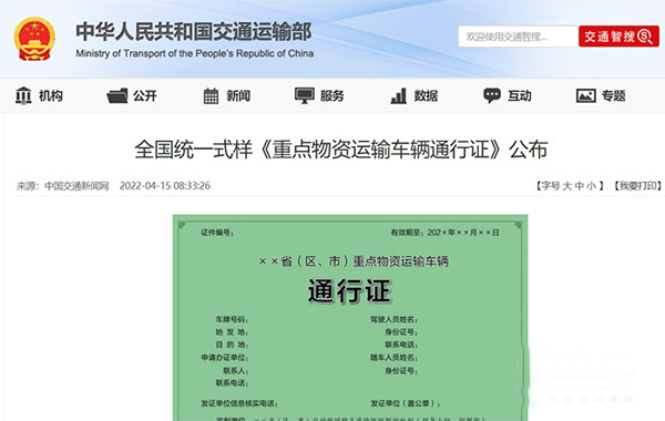 近日,按照國務院聯防聯控機制有關工作部署, 交通管控與運輸保障專班印發通知,公布了《重點物資運輸車輛通行證》(簡稱通行證)式樣(如圖),推動建立統一規范的通行證制度,保障涉疫地區重點物資運輸。